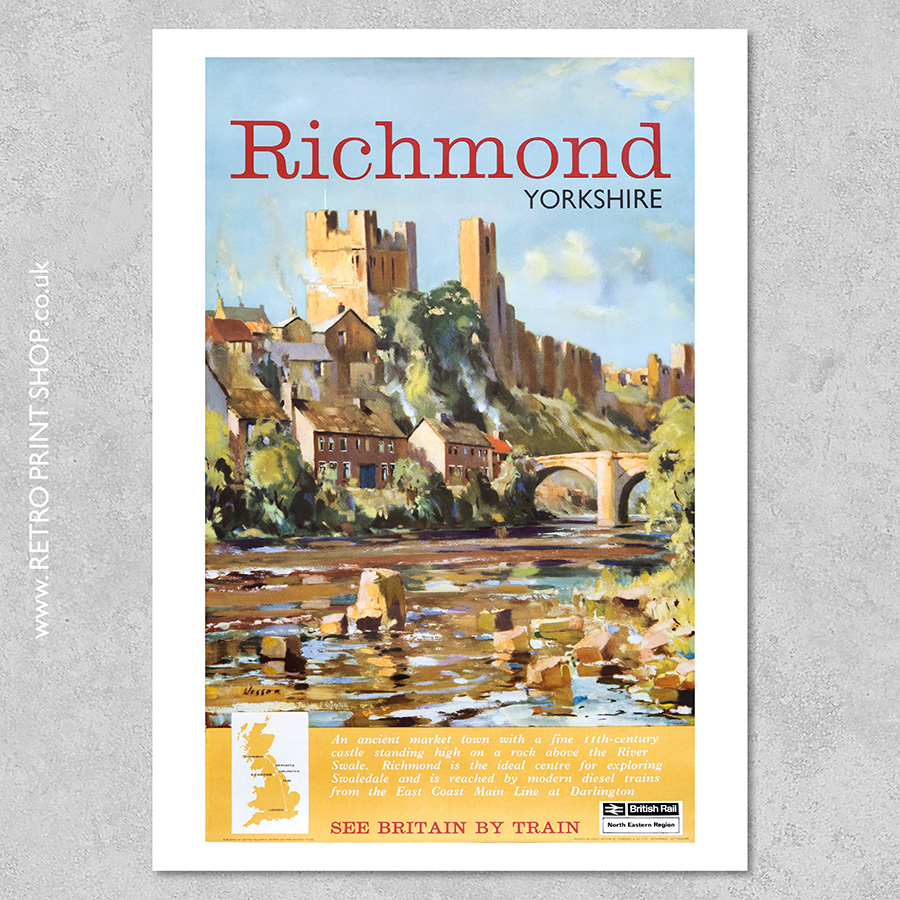 Wording: Richmond, Yorkshire. An ancient market town with a fine 11th Century castle standing high on a rock above the River Swale. Richmond is the ideal centre for exploring Swaledale and is reached by modern diesel trains from the East Coast Main Line and Darlington. See Britain by train. British Railways North Eastern Region.