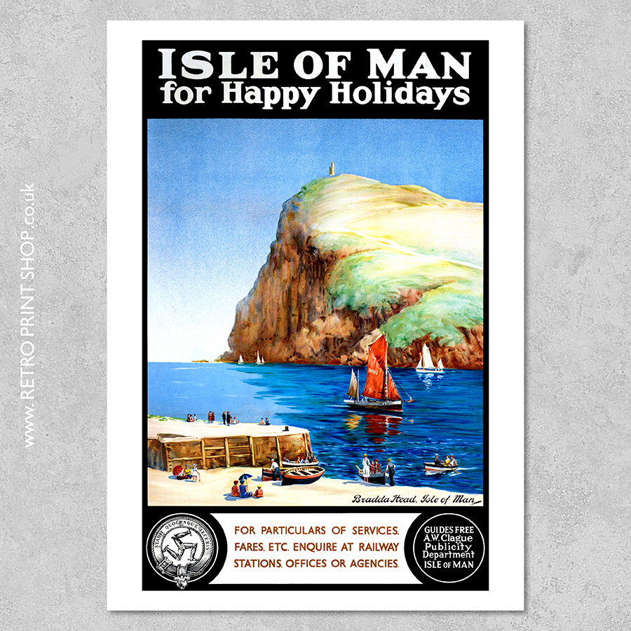 Wording: Isle of Man for Happy Holidays. Bradda Head, Isle of Man. For particulars of services, fares, etc enquire at railway stations, offices or agencies. Guide free. A.W. Clague, Publicity Department, Isle of Man.
