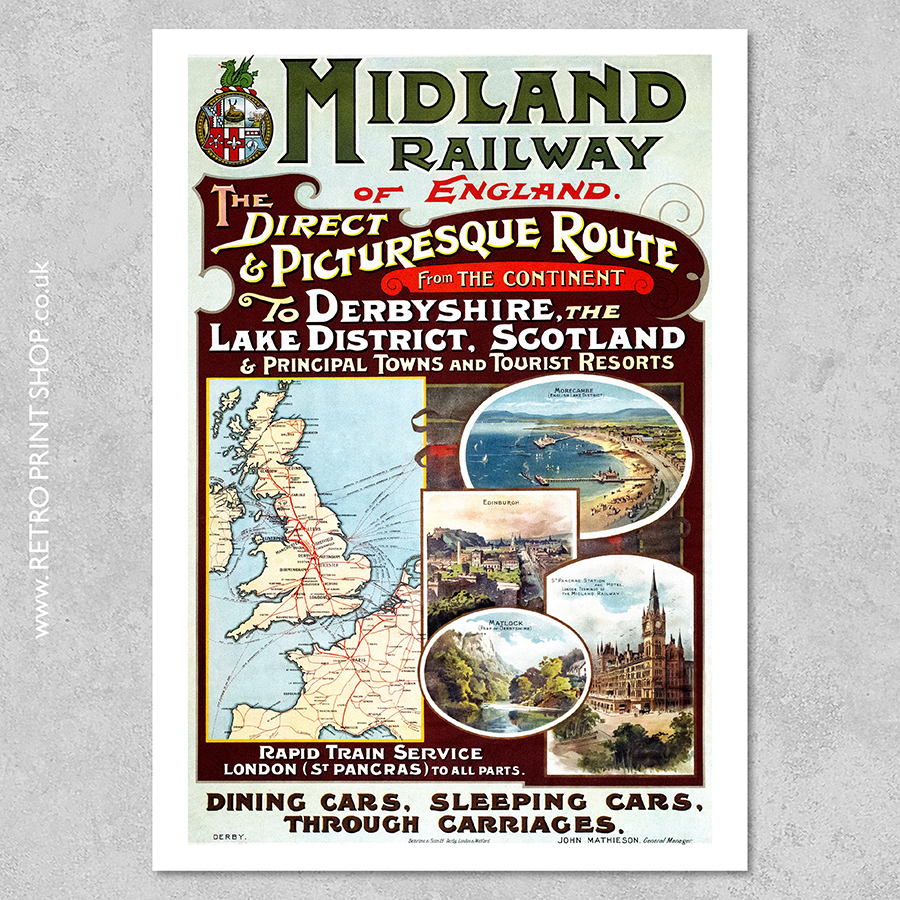 Wording: Midland Railway of England. The prefect and picturesque route from the continent to Derbyshire, the Lake District, Scotland, principal towns and tourist resorts. Rapid train service London (St Pancras) to all parts. Dining cars, sleeping cars, through carriages.